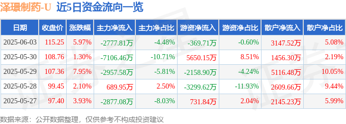 证券之星消息,截至2025年6月3日收盘,泽璟制药(688266)报收于115.25元,上涨5.97%,换手率2.06%,成交量5.44万手,成交额6.2亿元。