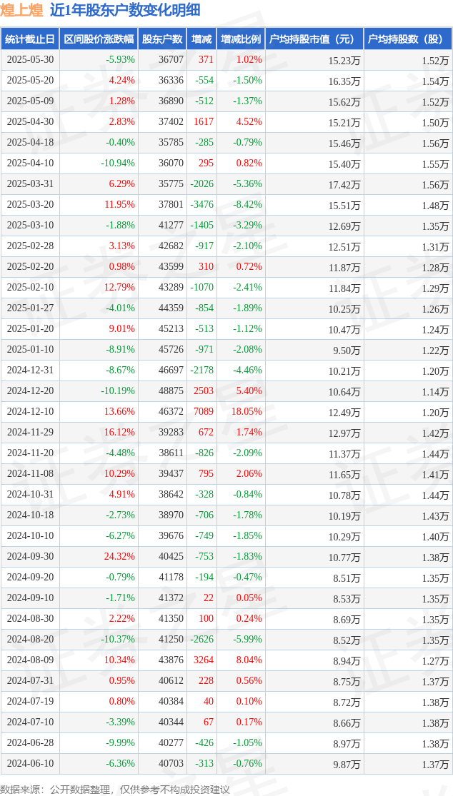 从股价来看,2025年5月20日至2025年5月30日,煌上煌区间跌幅为5.93%,在此期间股东户数增加371.0户,增幅为1.02%。