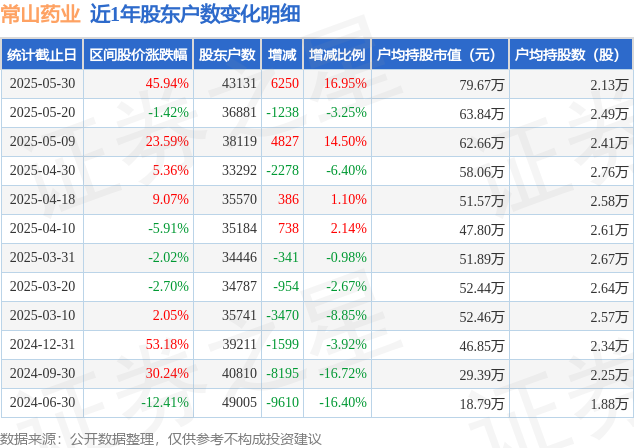 从股价来看,2025年5月20日至2025年5月30日,常山药业区间涨幅为45.94%,在此期间股东户数增加6250.0户,增幅为16.95%。