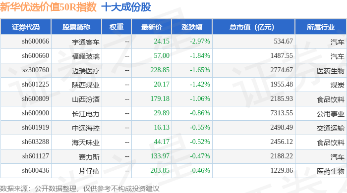 新华优选价值50R(489004)指数十大成份股详情如下: