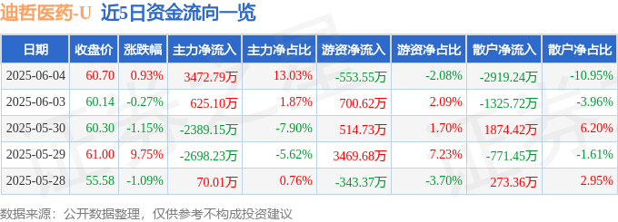 证券之星消息,截至2025年6月4日收盘,迪哲医药(688192)报收于60.7元,上涨0.93%,换手率2.33%,成交量4.35万手,成交额2.67亿元。
