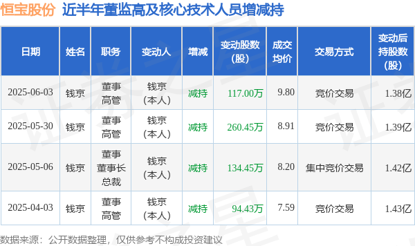 恒宝股份近半年内的董监高及核心技术人员增减持详情如下:
