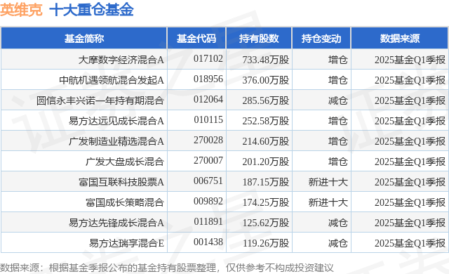 根据2025基金Q1季报公募基金重仓股数据,重仓该股的公募基金共46家,其中持有数量最多的公募基金为摩根士丹利基金的大摩数字经济混合A。大摩数字经济混合A目前规模为28.01亿元,最新净值1.296(6月4日),较上一交易日上涨1.83%,近一年上涨30.34%。该公募基金现任基金经理为雷志勇。雷志勇在任的基金产品包括:大摩科技领先混合A,管理时间为2019年4月20日至今,期间收益率为74.63%;大摩万众创新混合A,管理时间为2020年5月7日至今,期间收益率为-19.01%;大摩景气智选混合A,管理时间为2025年5月16日至今,期间收益率为-0.04%。