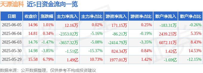 6月5日的资金流向数据方面,主力资金净流入12.16万元,占总成交额0.02%,游资资金净流入171.15万元,占总成交额0.25%,散户资金净流出183.31万元,占总成交额0.26%。