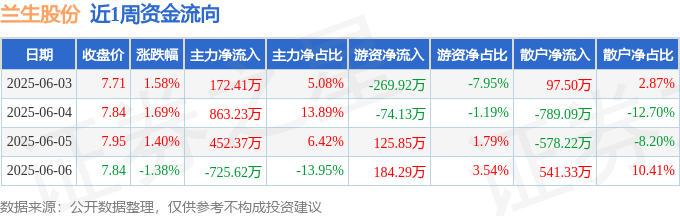资金流向数据方面,本周兰生股份主力资金合计净流入762.39万元,游资资金合计净流出33.91万元,散户资金合计净流出728.48万元。本周资金流向一览见下表: