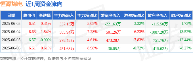 资金流向数据方面,本周恒源煤电主力资金合计净流入1653.22万元,游资资金合计净流入716.86万元,散户资金合计净流出2370.08万元。本周资金流向一览见下表: