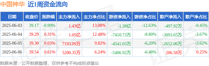 资金流向数据方面,本周中国神华主力资金合计净流入3.72亿元,游资资金合计净流出3.12亿元,散户资金合计净流出6037.05万元。本周资金流向一览见下表: