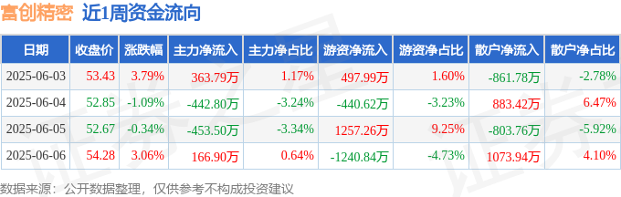 资金流向数据方面,本周富创精密主力资金合计净流出365.61万元,游资资金合计净流入73.78万元,散户资金合计净流入291.82万元。本周资金流向一览见下表:
