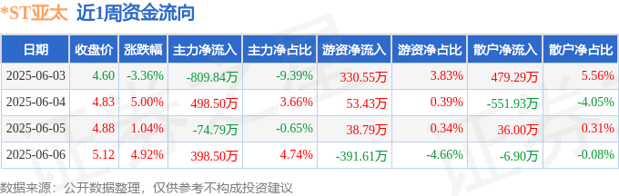 资金流向数据方面,本周*ST亚太主力资金合计净流入12.37万元,游资资金合计净流入31.17万元,散户资金合计净流出43.54万元。本周资金流向一览见下表: