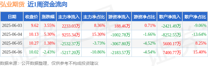 资金流向数据方面,本周弘业期货主力资金合计净流入3738.8万元,游资资金合计净流出6065.7万元,散户资金合计净流入2326.9万元。本周资金流向一览见下表:
