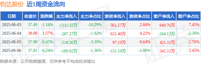 资金流向数据方面,本周钧达股份主力资金合计净流出2306.81万元,游资资金合计净流入938.96万元,散户资金合计净流入1367.85万元。本周资金流向一览见下表: