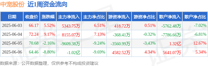 资金流向数据方面,本周中宠股份主力资金合计净流出6334.14万元,游资资金合计净流入1071.84万元,散户资金合计净流入5262.29万元。本周资金流向一览见下表: