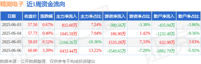 资金流向数据方面,本周精测电子主力资金合计净流入6127.36万元,游资资金合计净流出2210.02万元,散户资金合计净流出3917.34万元。本周资金流向一览见下表:
