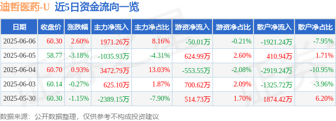 证券之星消息,截至2025年6月6日收盘,迪哲医药(688192)报收于60.3元,上涨2.6%,换手率2.18%,成交量4.07万手,成交额2.42亿元。