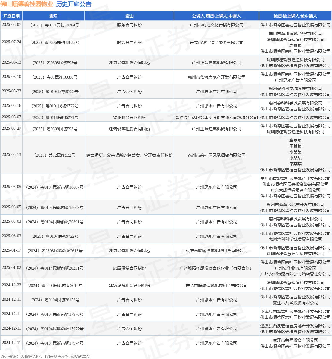 案号:(2025)粤01民终10680号根据统计,近一年内以佛山市顺德区碧桂园物业发展有限公司为当事人的历史开庭公告有48则,其中案由为“广告合同纠纷”的公告以20则居首,其次为“买卖合同纠纷”有9则,“建筑设备租赁合同纠纷”有4则。历史开庭公告(前20条)如下: