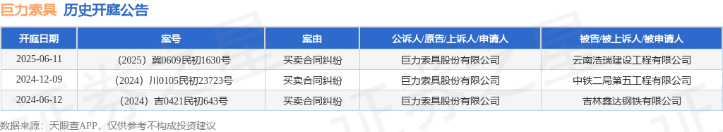 根据统计,近一年内以巨力索具股份有限公司为当事人的历史开庭公告有3则,其中案由为“买卖合同纠纷”的公告以3则居首。历史开庭公告如下: