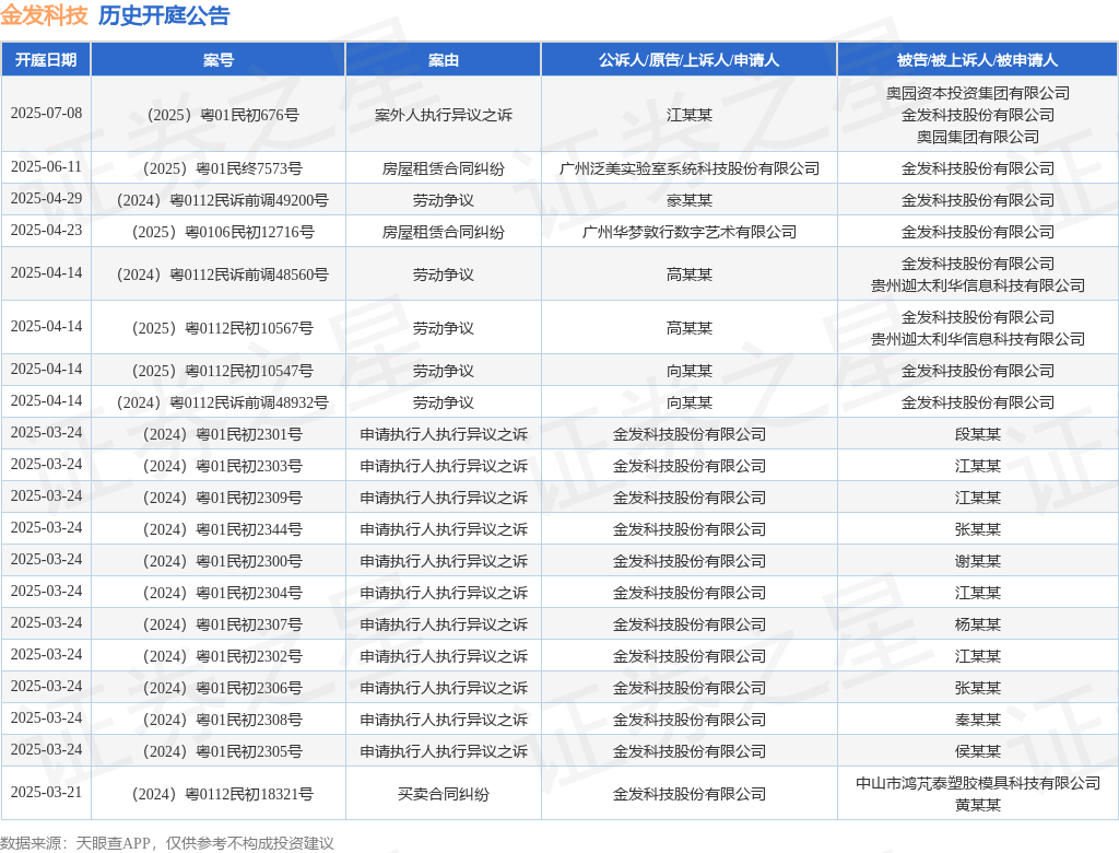 案号:(2025)粤01民终7573号根据统计,近一年内以金发科技股份有限公司为当事人的历史开庭公告有55则,其中案由为“买卖合同纠纷”的公告以20则居首,其次为“房屋租赁合同纠纷”有11则,“申请执行人执行异议之诉”有11则。历史开庭公告(前20条)如下: