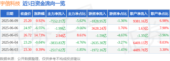 证券之星消息,截至2025年6月9日收盘,宇信科技(300674)报收于25.2元,上涨0.92%,换手率7.56%,成交量53.15万手,成交额13.44亿元。