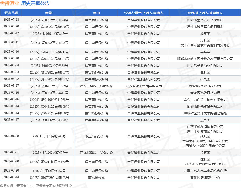 案号:(2025)皖0191民初847号根据统计,近一年内以舍得酒业股份有限公司为当事人的历史开庭公告有59则,其中案由为“侵害商标权纠纷”的公告以48则居首,其次为“商标权权属、侵权纠纷”有3则,“侵害商标权”有2则。历史开庭公告(前20条)如下: