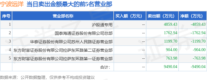 证券之星消息,沪深交易所2025年6月10日公布的交易公开信息显示,宁波远洋(601022)因有价格涨跌幅限制的日换手率达到20%的前五只证券登上龙虎榜。此次是近5个交易日内第1次上榜。