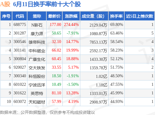 当日A股换手率前10大个股中7只个股收涨,平均涨幅50.1%,其中N影石(688775)以换手率69.8%排第一,5只个股近5个交易日中多次上榜。