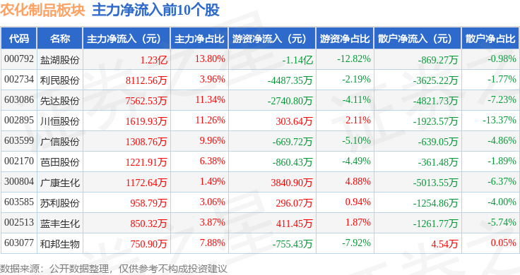 从资金流向上来看,当日农化制品板块主力资金净流出11.64亿元,游资资金净流入2.44亿元,散户资金净流入9.2亿元。农化制品板块个股资金流向见下表: