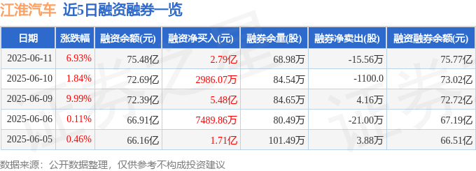江淮汽车融资融券信息显示,融资方面,当日融资买入15.53亿元,融资偿还12.74亿元,融资净买入2.79亿元,净买入额两市排名第3,连续3日净买入累计8.57亿元。融券方面,融券卖出2.36万股,融券偿还17.92万股,融券余量68.98万股,融券余额2895.09万元。融资融券余额75.77亿元。