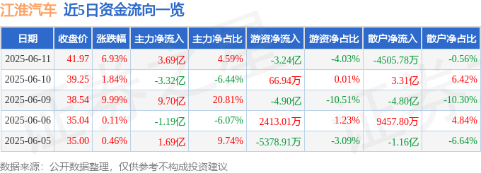 证券之星消息,截至2025年6月11日收盘,江淮汽车(600418)报收于41.97元,上涨6.93%,换手率8.77%,成交量191.55万手,成交额80.39亿元。