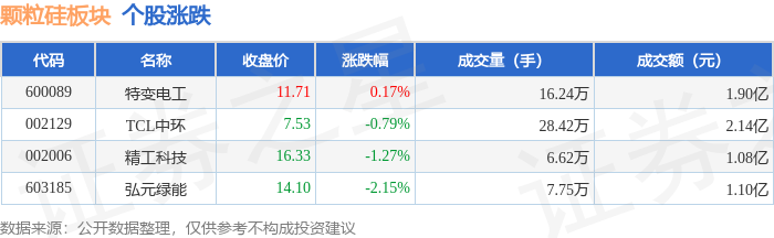 证券之星消息,6月12日颗粒硅板块较上一交易日上涨0.34%,特变电工领涨。当日上证指数报收于3402.66,上涨0.01%。深证成指报收于10234.33,下跌0.11%。颗粒硅板块个股涨跌见下表: