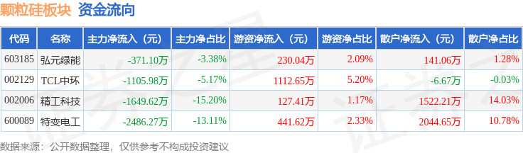 从资金流向上来看,当日颗粒硅板块主力资金净流出5612.97万元,游资资金净流入1911.72万元,散户资金净流入3701.25万元。颗粒硅板块个股资金流向见下表: