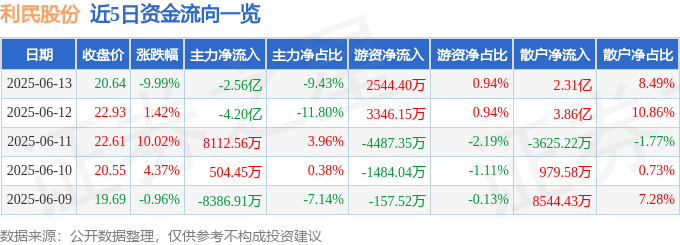 证券之星消息,截至2025年6月13日收盘,利民股份(002734)报收于20.64元,下跌9.99%,换手率33.68%,成交量127.65万手,成交额27.16亿元。