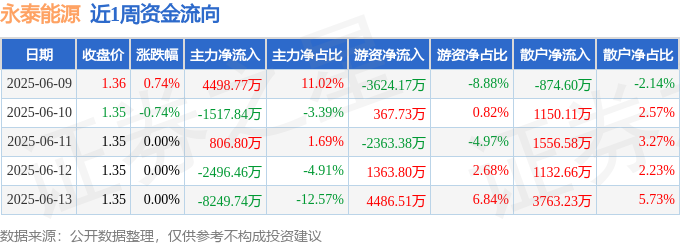 资金流向数据方面,本周永泰能源主力资金合计净流出6958.48万元,游资资金合计净流入230.49万元,散户资金合计净流入6727.99万元。本周资金流向一览见下表: