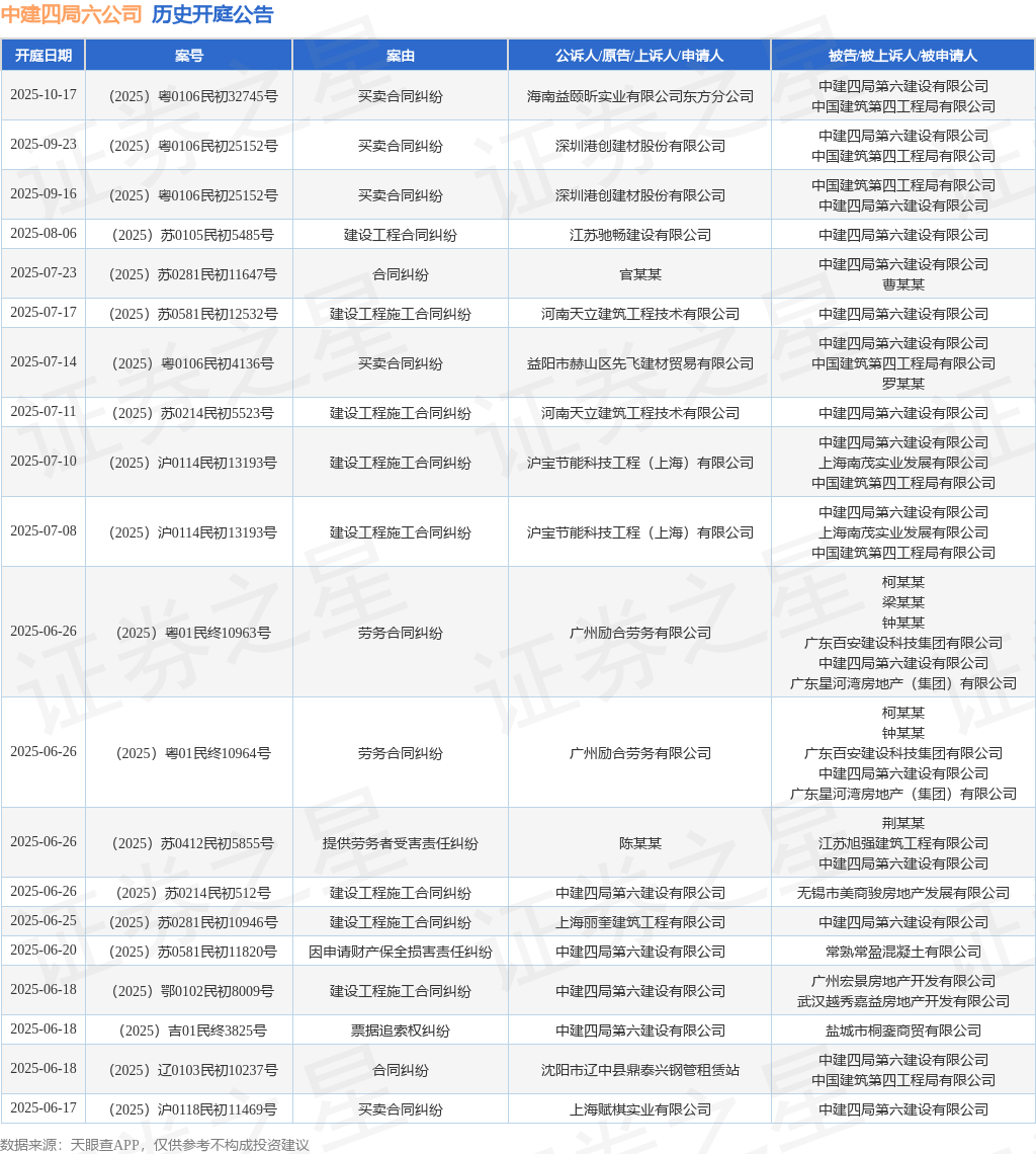 案号:(2025)沪0120民初13425号根据统计,近一年内以中建四局第六建设有限公司为当事人的历史开庭公告有301则,其中案由为“建设工程施工合同纠纷”的公告以96则居首,其次为“买卖合同纠纷”有48则,“建设工程分包合同纠纷”有32则。历史开庭公告(前20条)如下:
