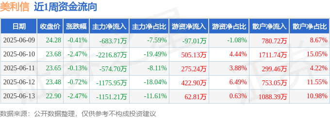 资金流向数据方面,本周美利信主力资金合计净流出5802.44万元,游资资金合计净流入1169.08万元,散户资金合计净流入4633.36万元。本周资金流向一览见下表: