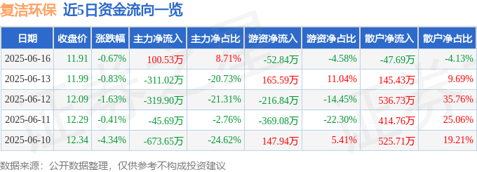 证券之星消息,截至2025年6月16日收盘,复洁环保(688335)报收于11.91元,下跌0.67%,换手率0.65%,成交量9609.0手,成交额1154.08万元。