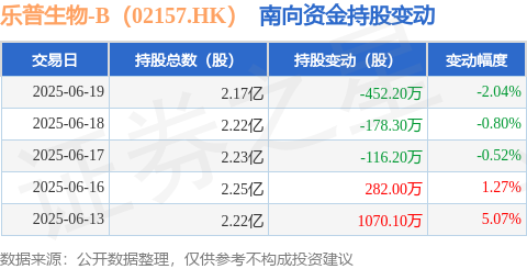证券之星消息,6月19日南向资金减持452.2万股乐普生物-B(02157.HK)。近5个交易日中,获南向资金增持的有2天,累计净增持605.4万股。近20个交易日中,获南向资金增持的有11天,累计净增持1644.28万股。截至目前,南向资金持有乐普生物-B(02157.HK)2.17亿股,占公司已发行普通股的13.09%。