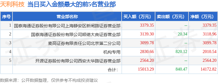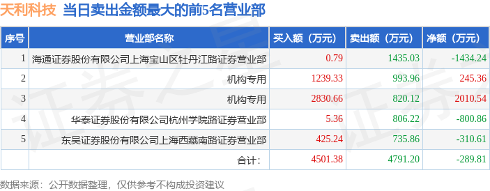 证券之星消息,沪深交易所2025年6月24日公布的交易公开信息显示,天利科技(300399)因日涨幅达到15%的前5只证券登上龙虎榜。此次是近5个交易日内第1次上榜。