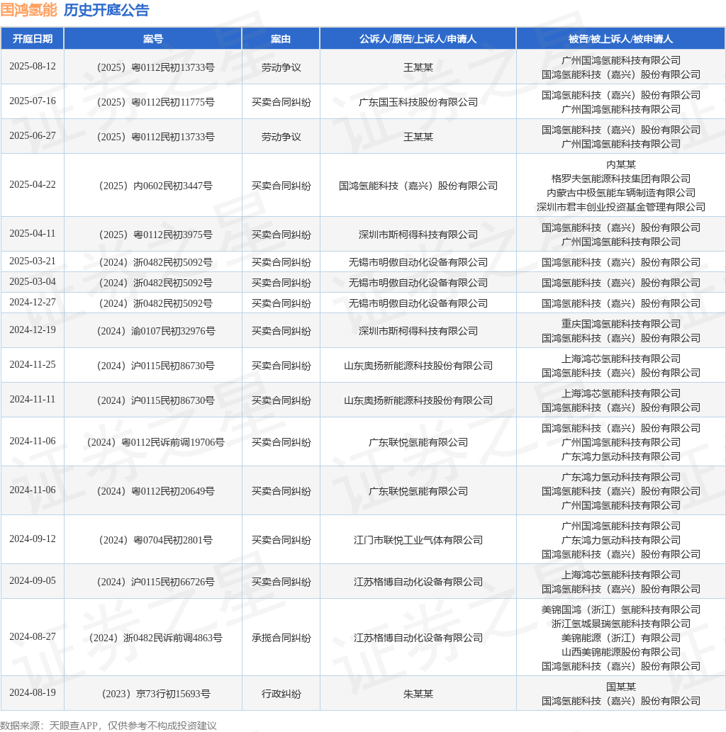 案号:(2025)粤0112民初13733号根据统计,近一年内以国鸿氢能科技(嘉兴)股份有限公司为当事人的历史开庭公告有17则,其中案由为“买卖合同纠纷”的公告以13则居首,其次为“劳动争议”有2则,“承揽合同纠纷”有1则。历史开庭公告如下:
