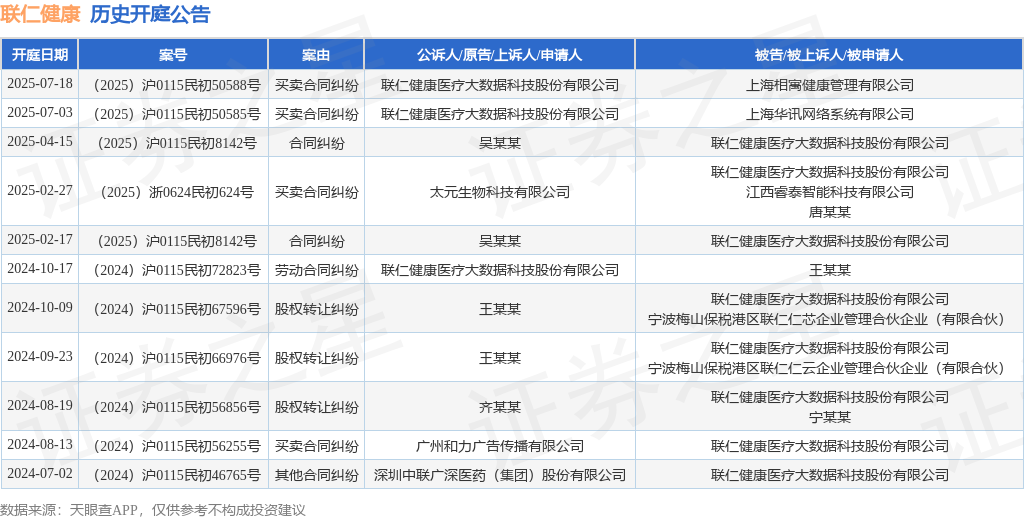 案号:(2025)沪0115民初50585号根据统计,近一年内以联仁健康医疗大数据科技股份有限公司为当事人的历史开庭公告有11则,其中案由为“买卖合同纠纷”的公告以4则居首,其次为“股权转让纠纷”有3则,“合同纠纷”有2则。历史开庭公告如下: