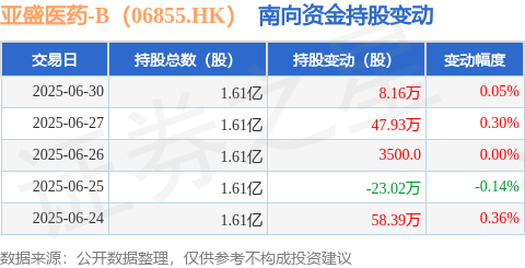 证券之星消息,6月30日南向资金增持8.16万股亚盛医药-B(06855.HK)。近5个交易日中,获南向资金增持的有4天,累计净增持91.81万股。近20个交易日中,获南向资金增持的有14天,累计净增持701.43万股。截至目前,南向资金持有亚盛医药-B(06855.HK)1.61亿股,占公司已发行普通股的46.28%。