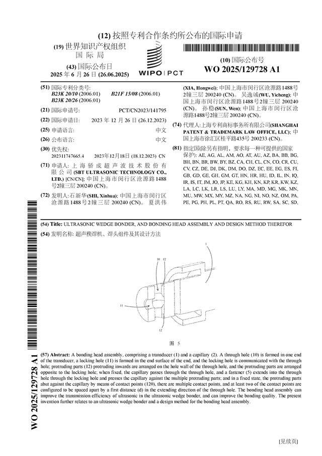证券之星消息,根据企查查数据显示骄成超声(688392)公布了一项国际专利申请,专利名为“超声楔焊机、焊头组件及其设计方法”,专利申请号为PCT/CN2023/141795,国际公布日为2025年6月26日。