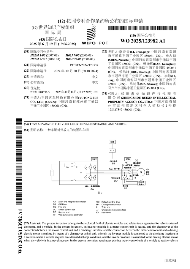 证券之星消息,根据企查查数据显示宇通客车(600066)公布了一项国际专利申请,专利名为“一种车辆对外放电的装置和车辆”,专利申请号为PCT/CN2024/128539,国际公布日为2025年6月19日。