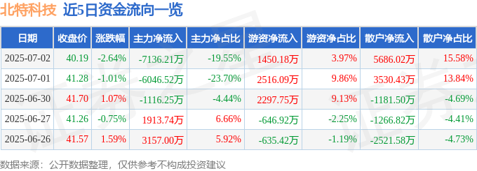 7月2日的资金流向数据方面,主力资金净流出7136.21万元,占总成交额19.55%,游资资金净流入1450.18万元,占总成交额3.97%,散户资金净流入5686.02万元,占总成交额15.58%。