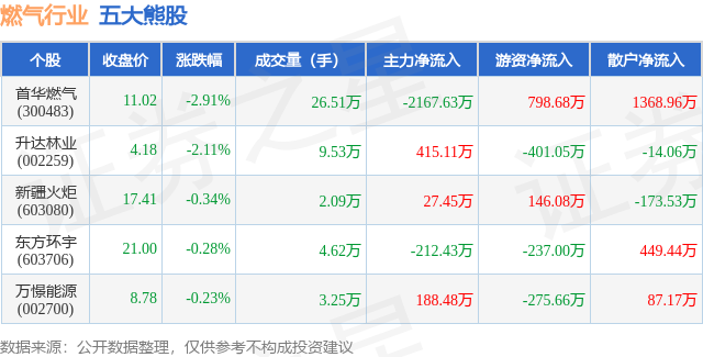 个股表现方面,燃气行业当日领跌股为首华燃气(300483),该股当日报收11.02,下跌2.91%,成交量26.51万,主力资金净流出2167.63万元。升达林业(002259)以下跌2.11%紧随其后,该股当日成交量9.53万,主力资金净流入415.11万元。除此之外,新疆火炬(603080)、东方环宇(603706)、万憬能源(002700)均进入当日熊股之列。具体个股列表见下表: