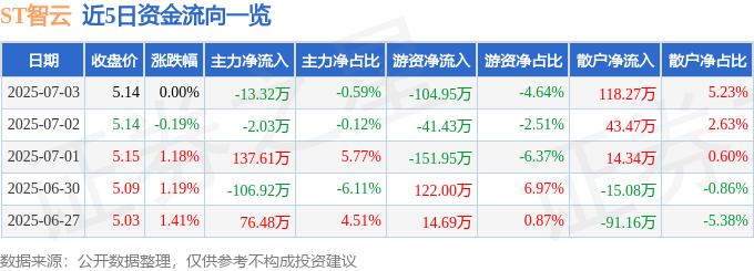 证券之星消息,截至2025年7月3日收盘,ST智云(300097)报收于5.14元,上涨0.0%,换手率1.63%,成交量4.41万手,成交额2259.97万元。