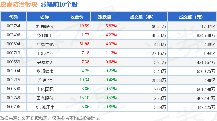 证券之星消息,7月4日虫害防治板块较上一交易日下跌0.9%,新农股份领跌。当日上证指数报收于3472.32,上涨0.32%。深证成指报收于10508.76,下跌0.25%。虫害防治板块个股涨跌见下表: