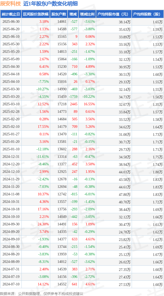 从股价来看,2025年6月20日至2025年6月30日,辰安科技区间涨幅为3.18%,在此期间股东户数减少527.0户,减幅为3.61%。