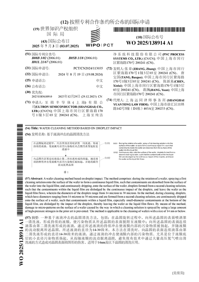 证券之星消息,根据企查查数据显示至纯科技(603690)公布了一项国际专利申请,专利名为“基于液滴冲击的晶圆清洗方法”,专利申请号为PCT/CN2024/113035,国际公布日为2025年7月3日。