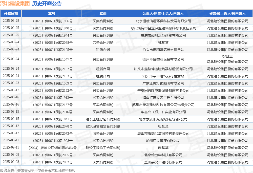 案号:(2025)冀06民终3998号根据统计,近一年内以河北建设集团股份有限公司为当事人的历史开庭公告有1457则,其中案由为“买卖合同纠纷”的公告以535则居首,其次为“建设工程施工合同纠纷”有217则,“劳务合同纠纷”有129则。历史开庭公告(前20条)如下: