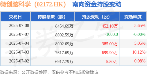 证券之星消息,7月8日南向资金增持452.1万股微创脑科学(02172.HK)。近5个交易日中,获南向资金增持的有4天,累计净增持1542.7万股。近20个交易日中,获南向资金增持的有14天,累计净增持3309.48万股。截至目前,南向资金持有微创脑科学(02172.HK)8454.69万股,占公司已发行普通股的14.45%。